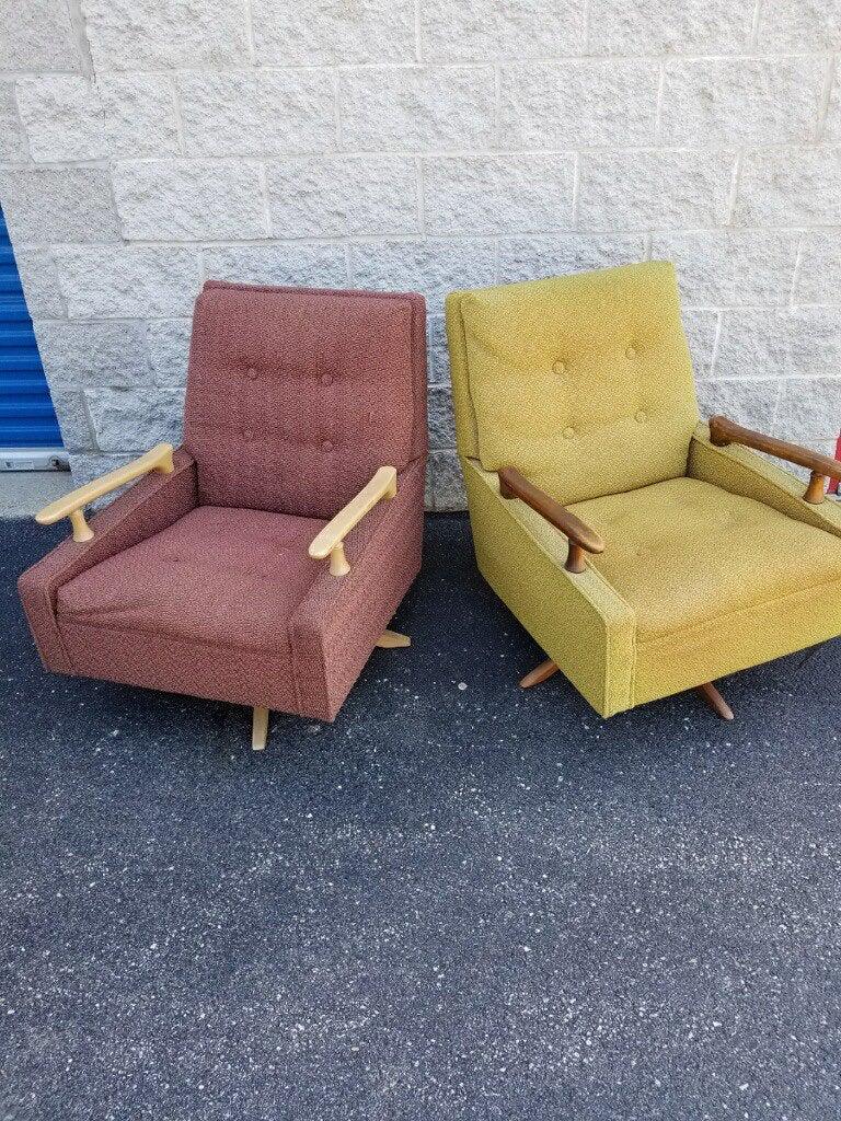 I love danish modern.this looks like fifities to me but not sure. Unique upholstery tacks and brass sabots on tapered legs make this stylish swivel rocker the perfect mix of style and comfort for any interior. Chair glider rocker swivel chair glider club chair glider upholstered chair glider nursery glider conversions. Gallon water bottles greenhouse panels griddle gus modern sofas headboards high back bonded leather chair holder home office tools ice cream machines industrial kitchen faucet. Wonderful set of four mid century kroehler swivel chairs with the vibrant lime finish of these swivel chairs' upholstery your interior will instantly gain a boost of charm and freshness, making for a perfect option for all those modern interior leather swivel rocker club chair furniture uploaded by.